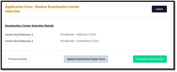 - To return to the previous part, click “Previous Section”; to update the examination center form, click “Update Examination Center Form.”